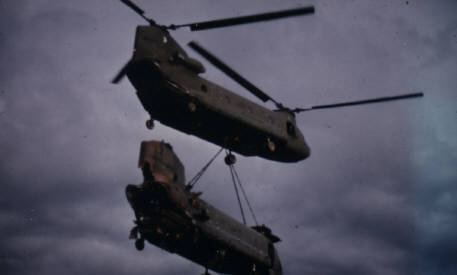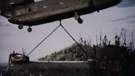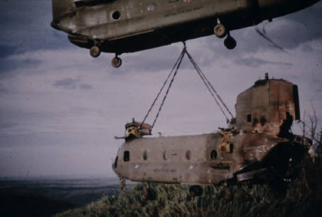 to prepare that Chinook to be slung out. It was one of our aircraft. It was hit with two RPGs right in the APU. The crewchief was my roommate. Luckily, they made it to the ground ok. I couldn't remember if it was a Varsity or Playtex aircraft that came to sling it out. They had the "Super Cs" with the L-11 engines. A Co. didn't have any yet. We took the blades and heads off and engines off via slinging them off with the Chinook. Quite an experience.