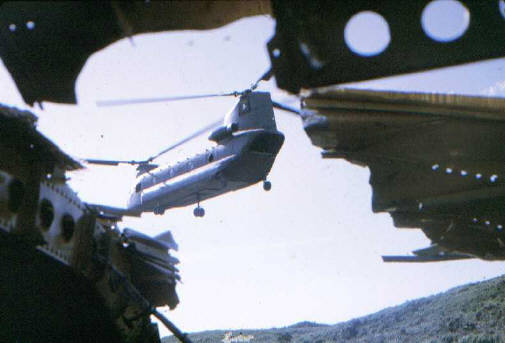 Ripcord and flew it to Camp Evans. The bird Jeff was flying had all but JP-4 fumes drained to allow him to lift the other aircraft, but after the successful lift, he didn't have quite enough to make it all the way to Evans POL and crashed a few hundred yards from touchdown. |