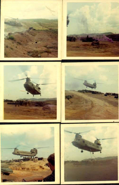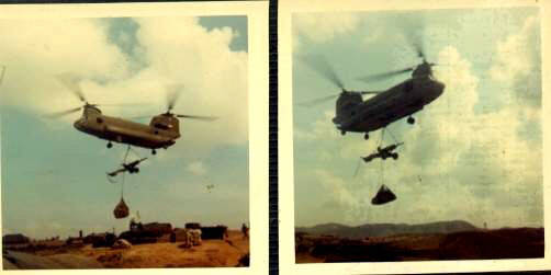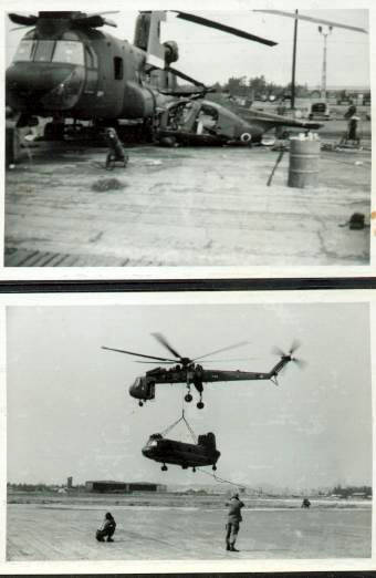Khe Sahn. I can still remember the terrified voice on the radio as we were just completing a PAR to Phu Bai. The guys in the BOQ could hear him circling overhead trying to find the ground. As we were shutting down, our FE said "there's a LOH over the ramp and I think he's going to crash, yup, I know he's going to crash". The pilot walked away from it. The LOH main rotor sliced through some heavy structual members on the chinook, so the next photo is it being "medevaced". This chinook belonged to a different unit (either the Americal or the 179th) that had aircraft supporting Lamson 719. |