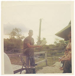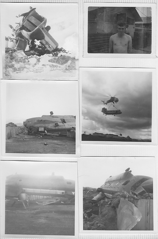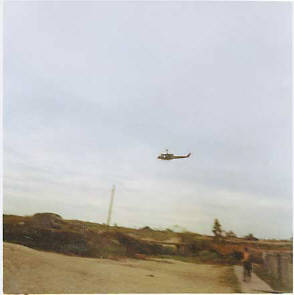 tests. Something went wrong and it flipped out of control, sending chunks of blades flying all around the company area and sending the movie-goers running for cover. Later, a CH-54 flew away with what was left. |